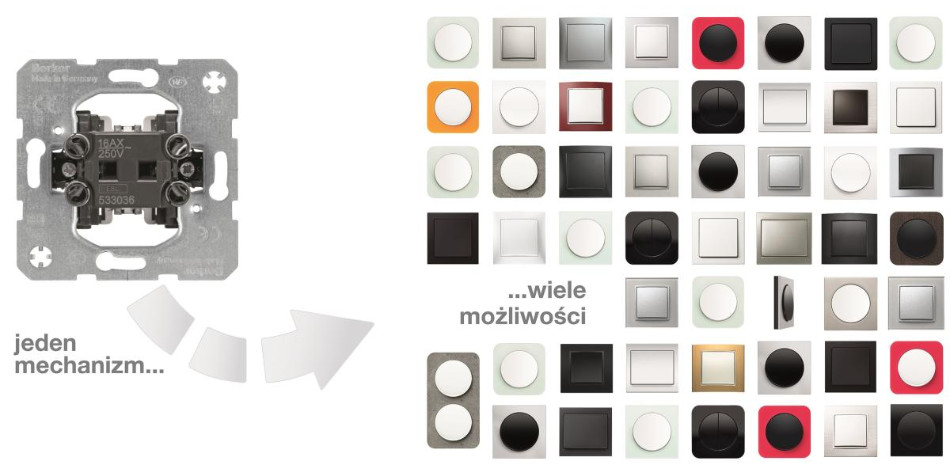 one.platform to innowacyjny, elastyczny system uniwersalnych mechanizmów, który umożliwia zmianę wyglądu gniazdka lub łącznika bez ingerencji w instalację elektryczną. Cały proces jest prosty i nie wymaga skomplikowanych narzędzi – wystarczy wybrać odpowiedni design. Elementy one.platform są kompatybilne z wieloma seriami Berker, w tym B.Kwadrat, B.3, B.7, Q.1, Q.3 oraz K.5.